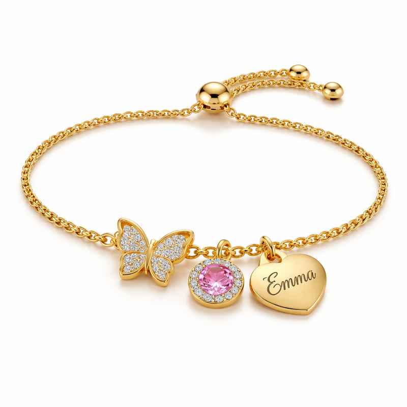 Perfect for everyday wear or special occasions, this butterfly birthstone charm bracelet complements both casual and formal outfits effortlessly. Its lightweight yet durable construction as personalized gold stainless steel jewelry ensures it stays brilliant through daily use. With its delicate design and meaningful customization, the custom butterfly charm bracelet becomes more than just jewelry—it becomes a story you wear.