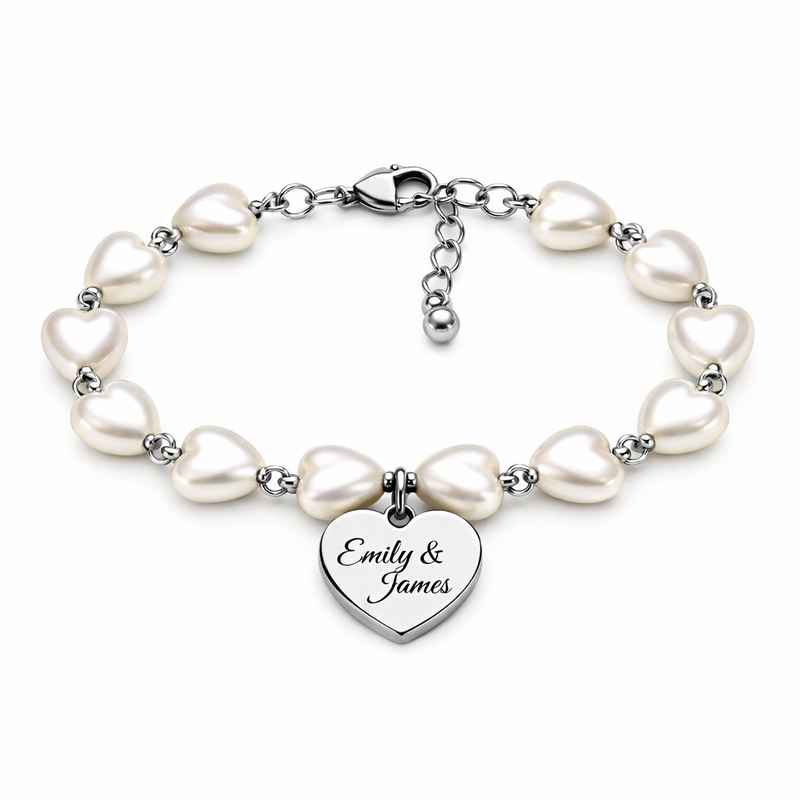 Dainty Romantic Charm Bracelet with Personalized Engraving Pearl Stainless Steel Love Heart Bracelet