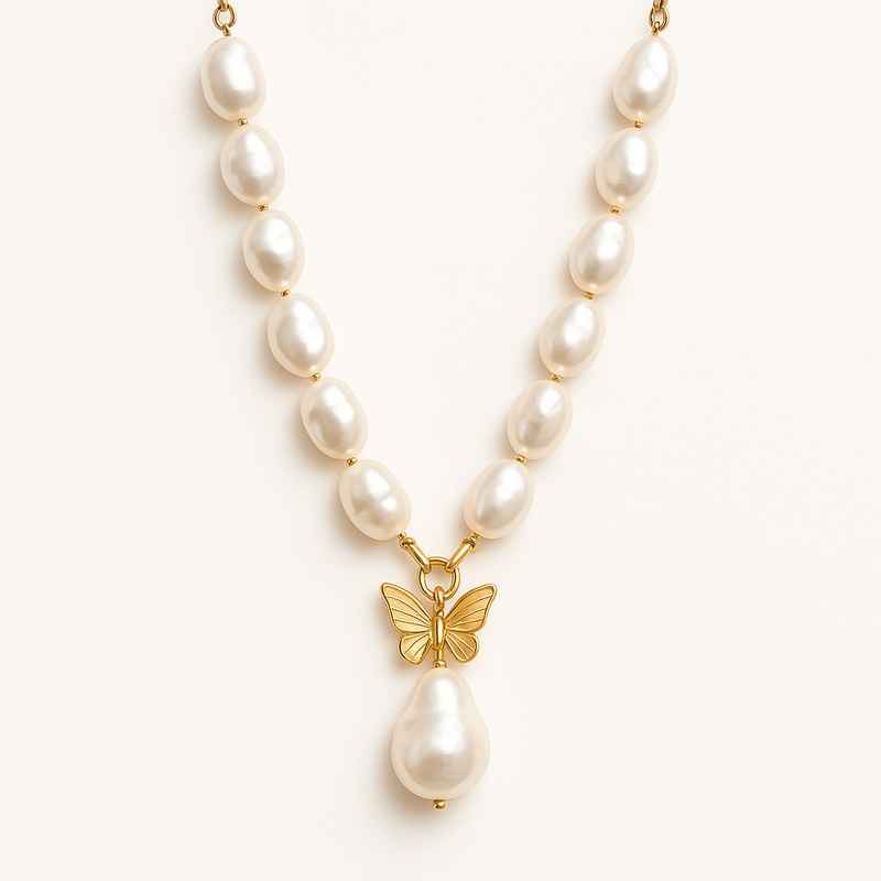 Sustainable Baroque Pearl Necklace with Butterfly Accent Gold Necklace