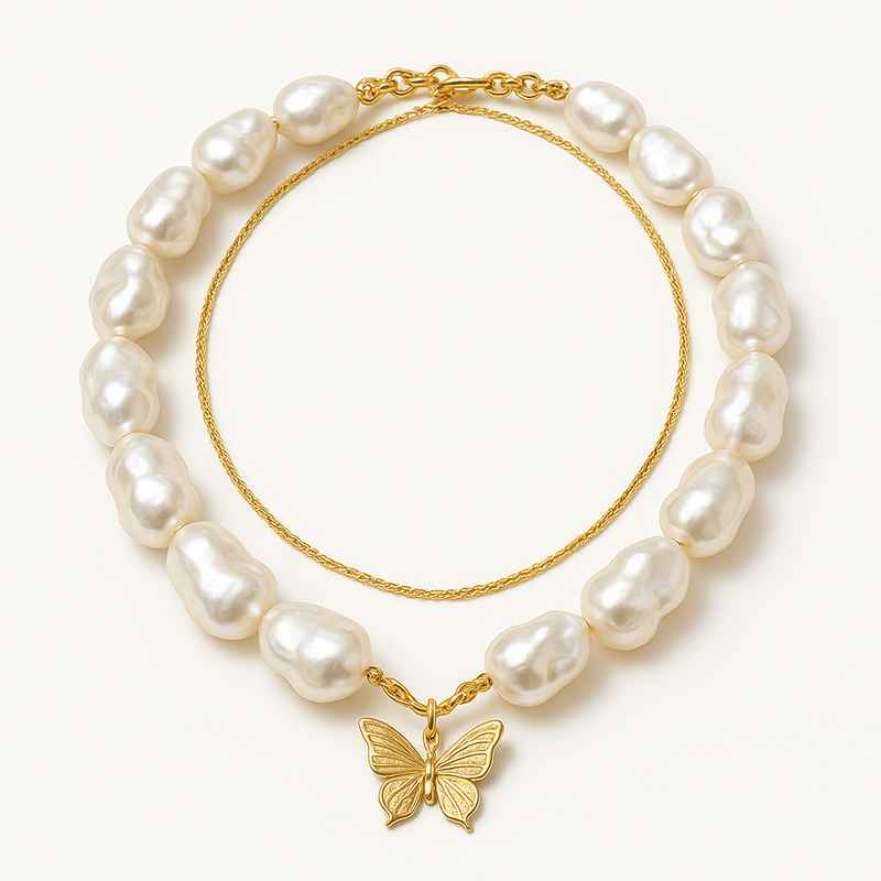 07/12/2025Sustainable Baroque Pearl Necklace with 14K Gold Plated Layering Necklace and Butterfly Accent Jewelry