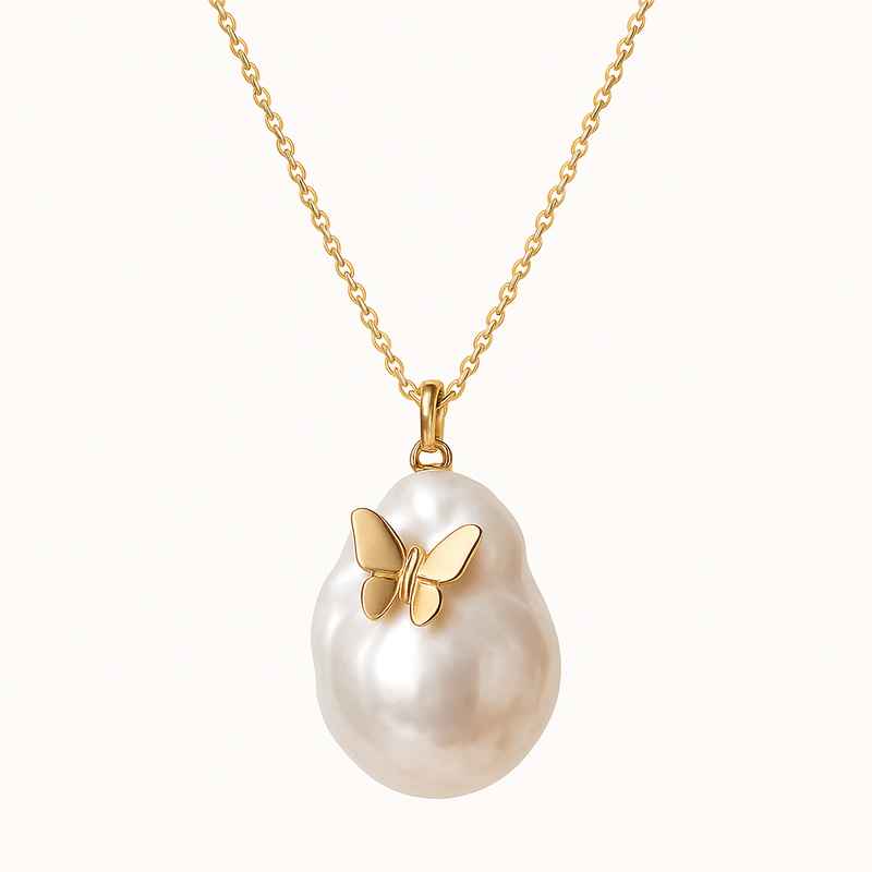 07/12/2025Sustainable Baroque Pearl Necklace with Butterfly Accent 14k Gold
