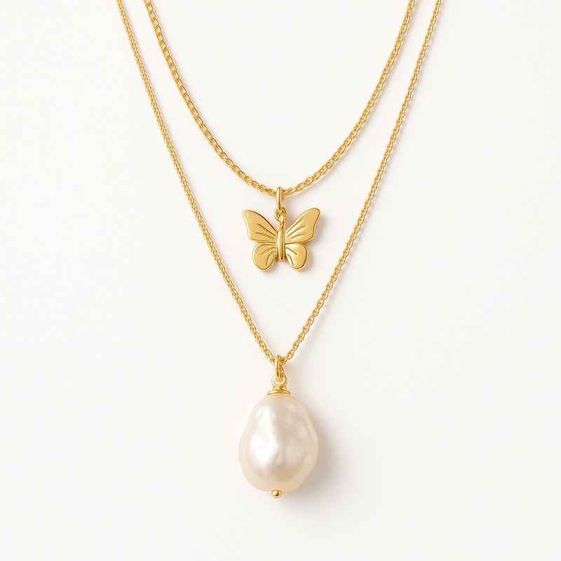 08/12/2025Sustainable Baroque Pearl Necklace with Butterfly Accent 14K Gold Plated