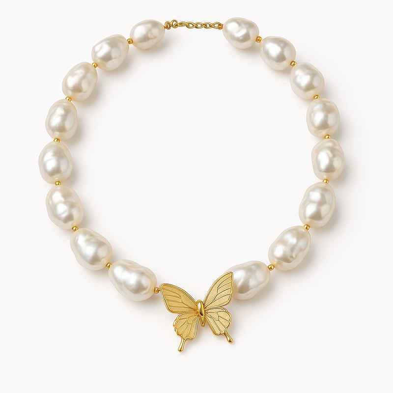 05/12/2025Sustainable Baroque Pearl Necklace with Butterfly Accent Gold Necklace